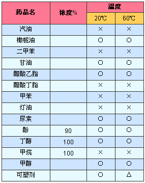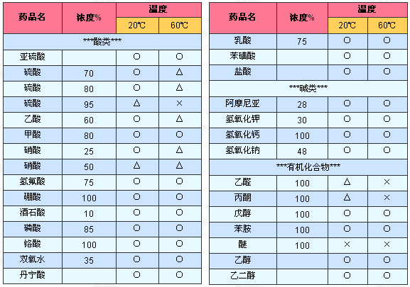 說(shuō)明:記號(hào) ○ 可以使用;△ 勉強(qiáng)可以使用;× 不可以使用。上述化學(xué)藥品裝載前如有疑問(wèn)或未記載之藥品,請(qǐng)咨詢本公司。